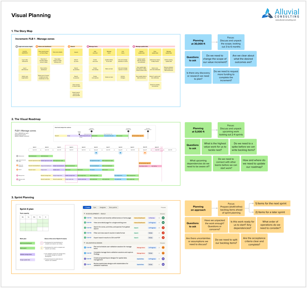 Planning at 30,000 ft: The Story Map We start by capturing the scope of a ‘value increment’: what will users actually be able to do when we deliver this work? A story map gives us a user-centred view of the whole before we’ve committed to anything specific.